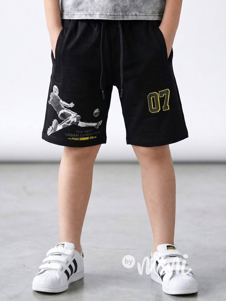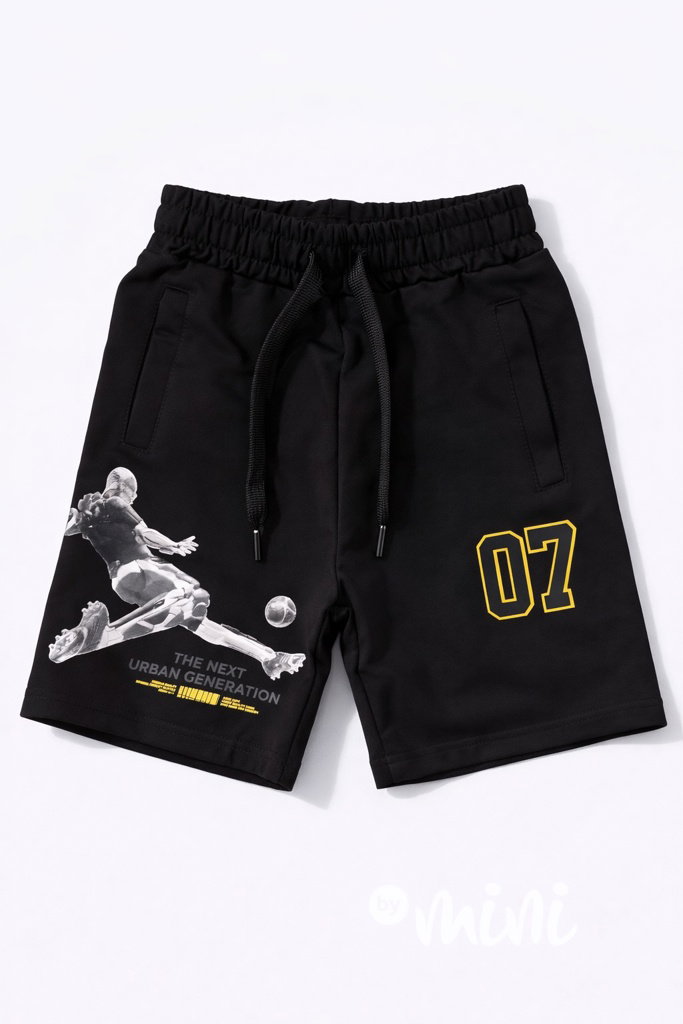 Bavlněné sporty kraťasy, pas na stretch gumu, kapsy po stranách, fotbalový motiv.