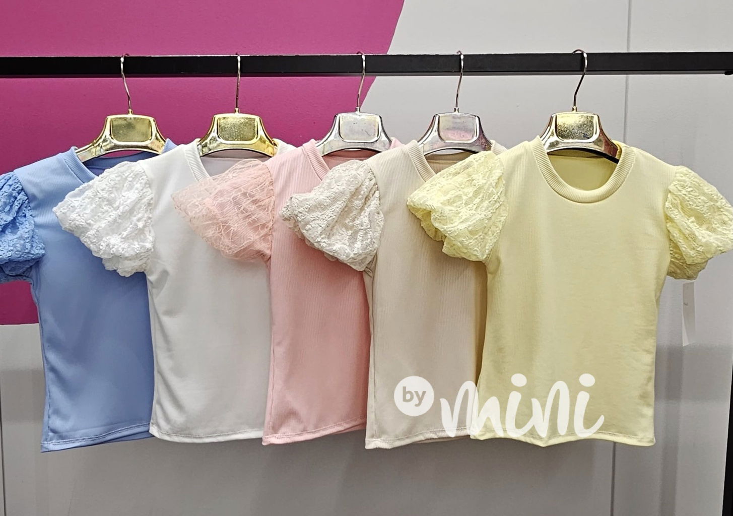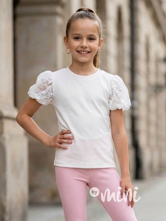 Stretch žebrovaná blůzka s nadýchanými krajkovými rukávy.