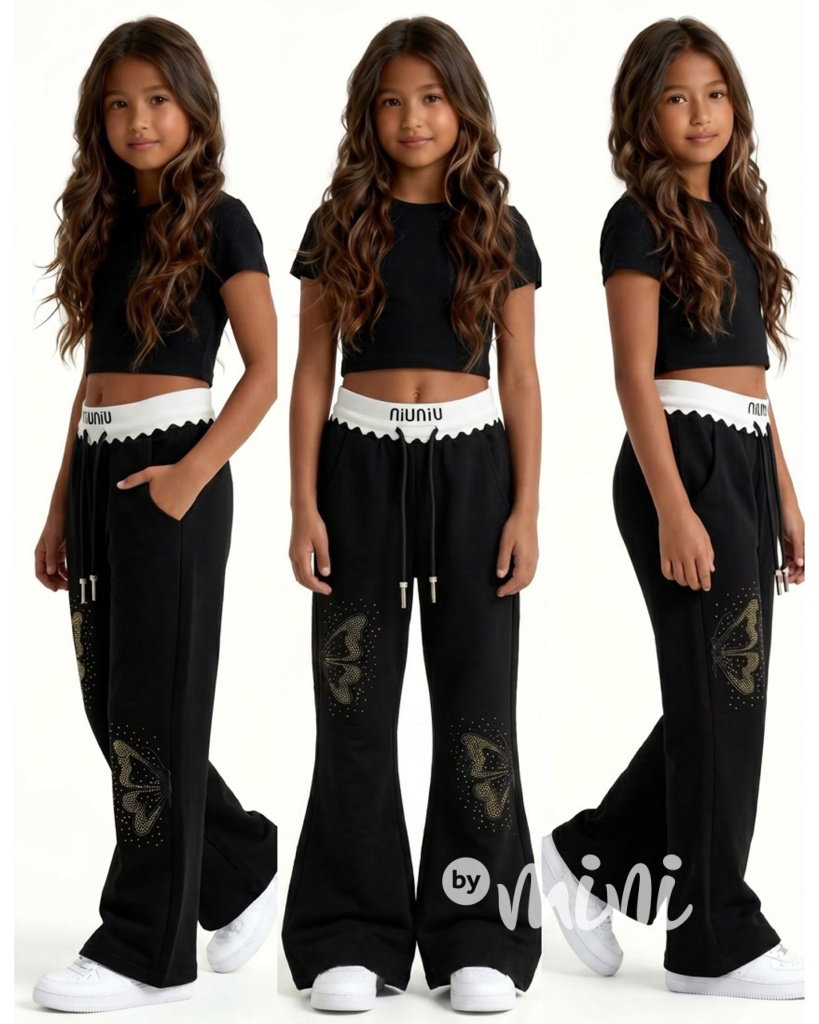 Moc hezké premium tepláky do zvonu s motýlkovým zdobením.