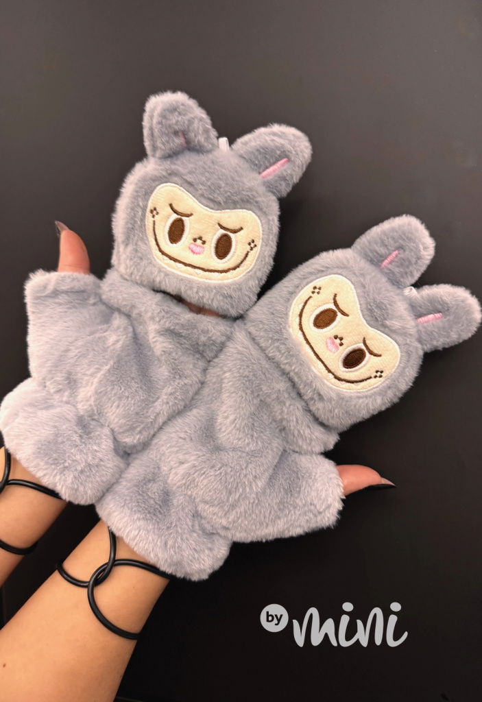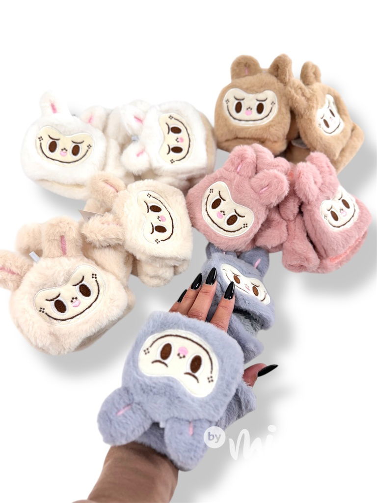 Chlupaté teplé rukavičky s motivem Labubu, lze nosit s volnými prsty nebo odepnout a zakrýt je.