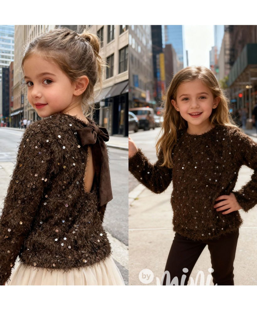 Chlupatý svetřík s flitry a mašlí hnědý