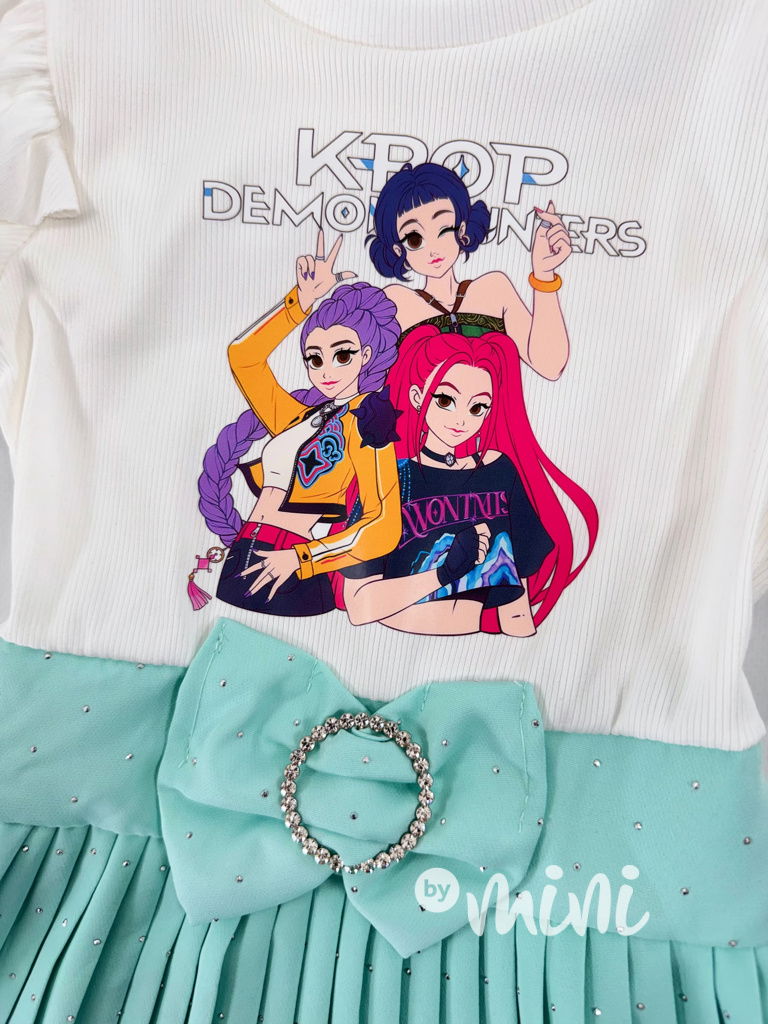 Šaty s plisovanou sukní poseté kamínky, motiv Huntrix vpředu.