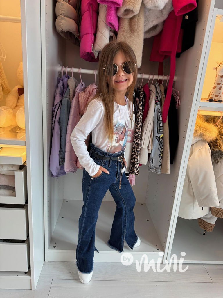 Denim zvonáče, pas na stretch gumu, pásek s řetízkem.