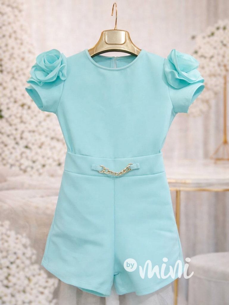 Moc hezký letní elegant overal s ozdobnou kytičkou na rukávu.