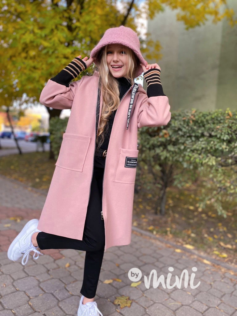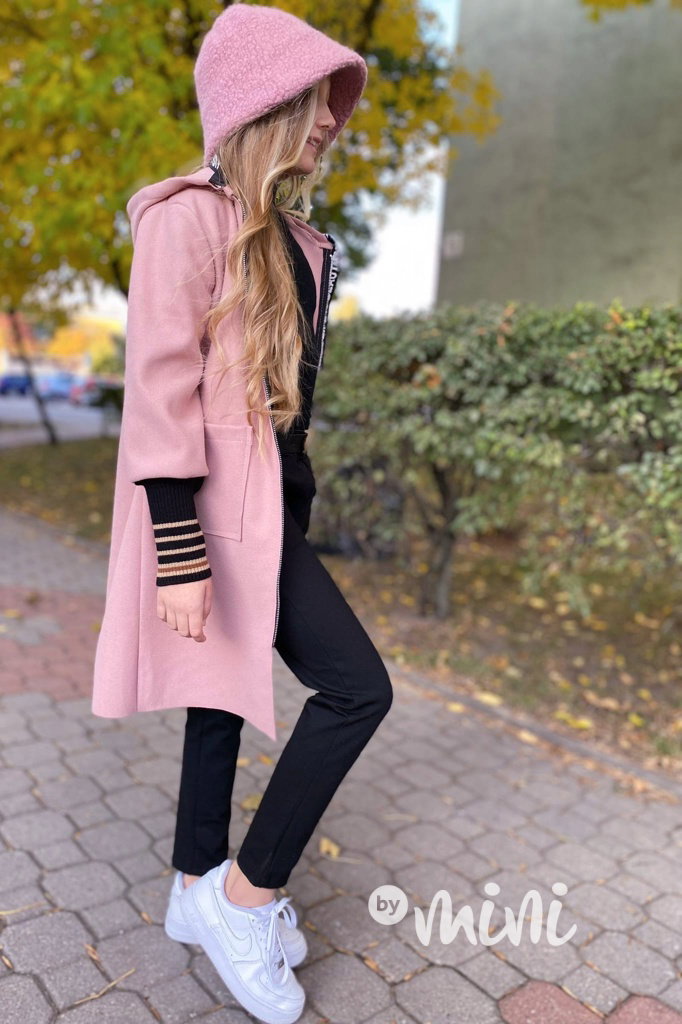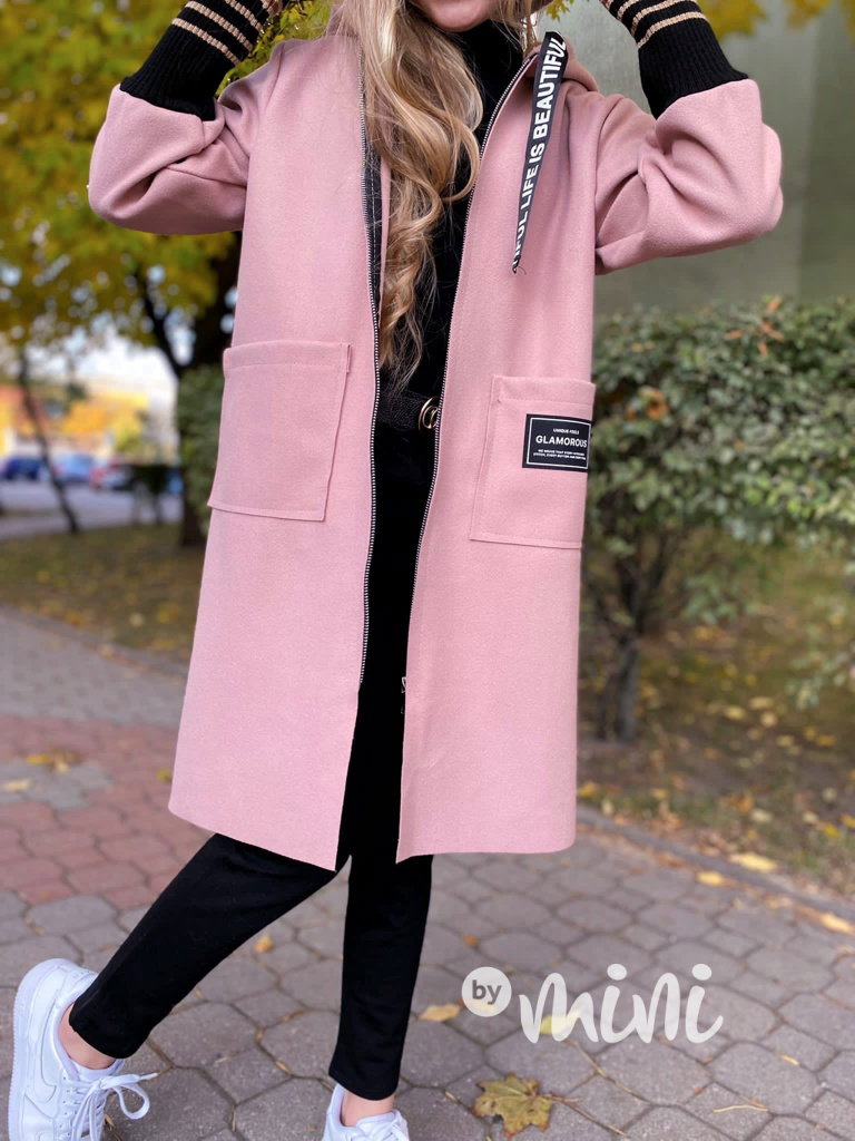 Stylový flauš kabát na zip, kapuce, vysoké náplety na rukávech.