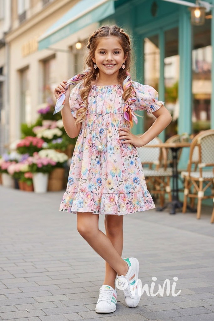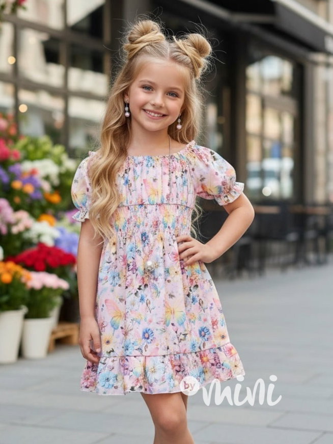 Krásné letní šaty s motivem kytiček a motýlků, řetízek do setu.