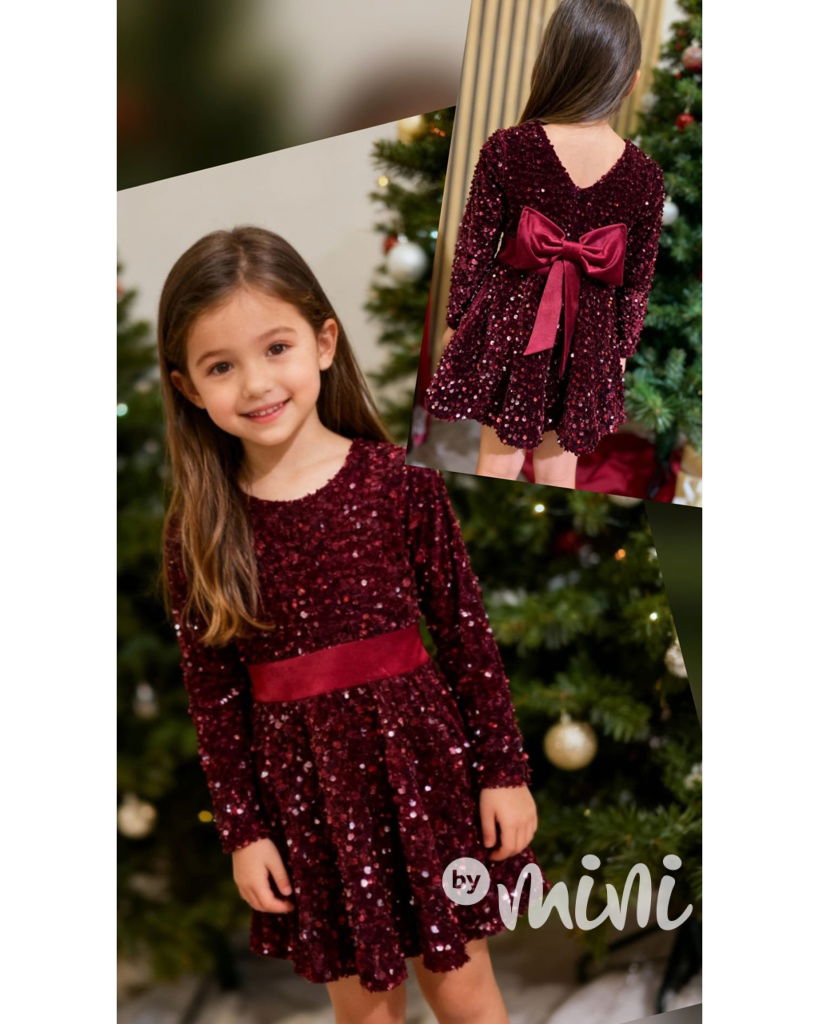 Glamour soft velur šaty s flitry a mašlí BORDO