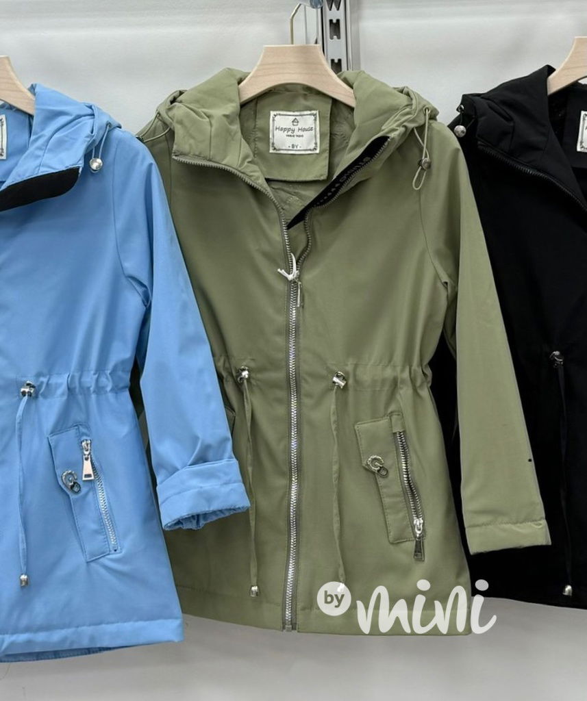 Jarní parka s kapucí, v pase na stahování, kapsy po stranách.