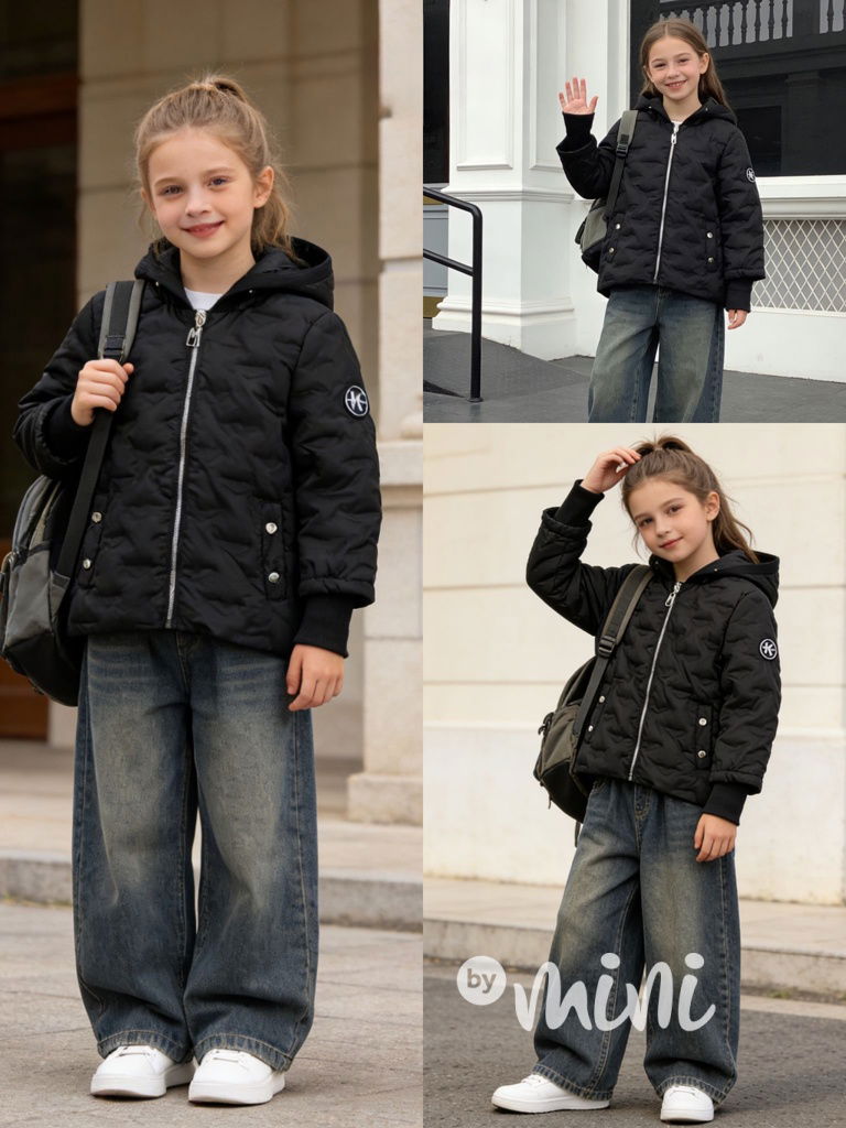 Jarní prošívaná bunda s velkou kapucí, módní střih.