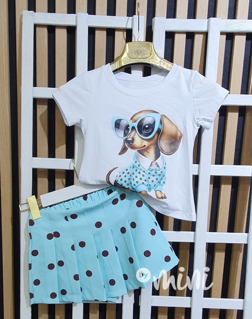Letní komplet: triko + puntíkaté sukňokraťasy (vypadají jako sukně - uvnitř našité kraťasy, pas na stretch gumu).