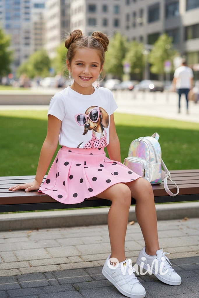 Letní komplet: triko + puntíkaté sukňokraťasy (vypadají jako sukně - uvnitř našité kraťasy, pas na stretch gumu).
