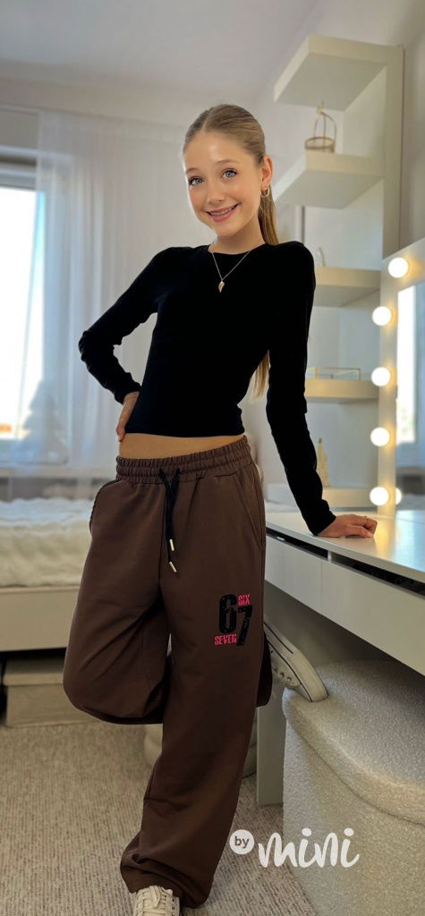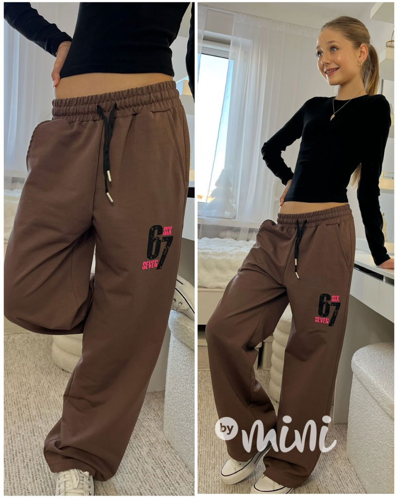 Stretch příjemné bavlněné tepláky volného lounge střihu, pas na stretch gumu, kapsy po stranách. Vpředu potisk 67.