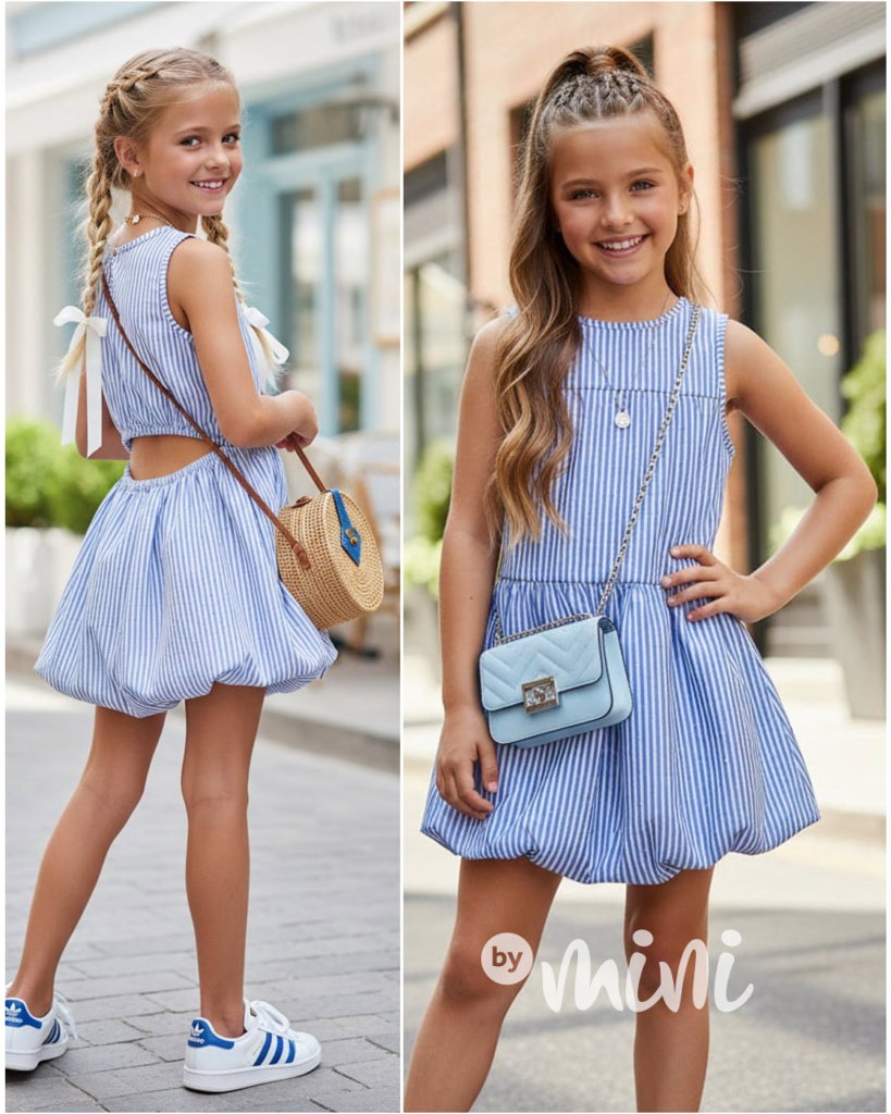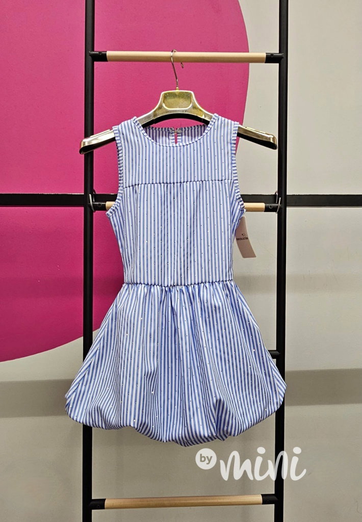 Letní pruhované šaty s otevřenými zády, poseté malými kamínky.