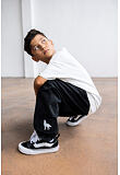 Designové soft denim baggy, pas na stretch gumu, kapsy po stranách, Mash Mnie černé logo.