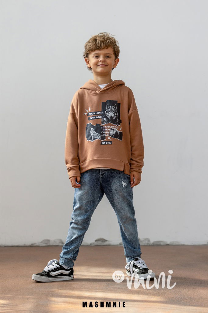 Designové soft denim džíny, pas na stretch gumu, kapsy po stranách, motiv vlka vpředu.