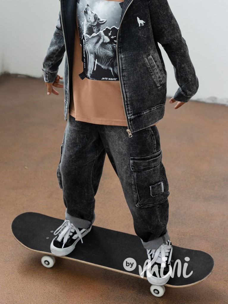 Designové soft denim kapsáče, motiv vlka, pas na stretch gumu, kapsy po stranách.