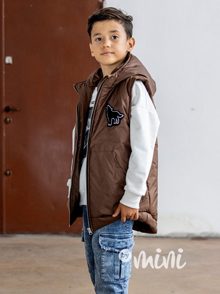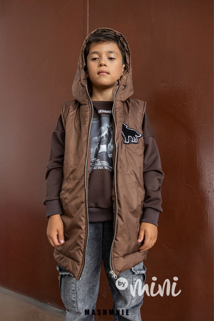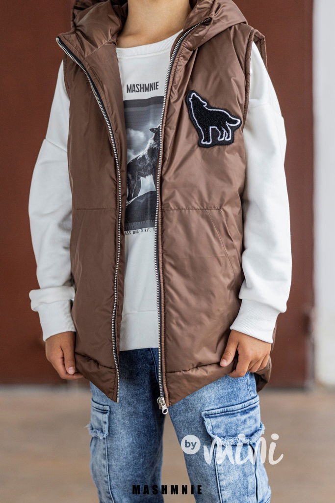 Designová podzimní vesta s motivem vlka, Mash Mnie černé logo.