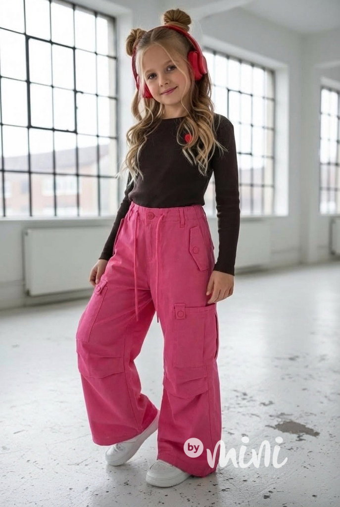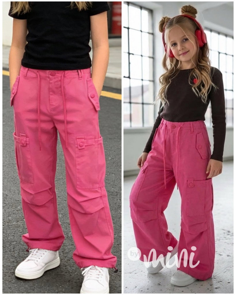 Trendy stretch růžové široké džíny, pas na gumu, kapsy.