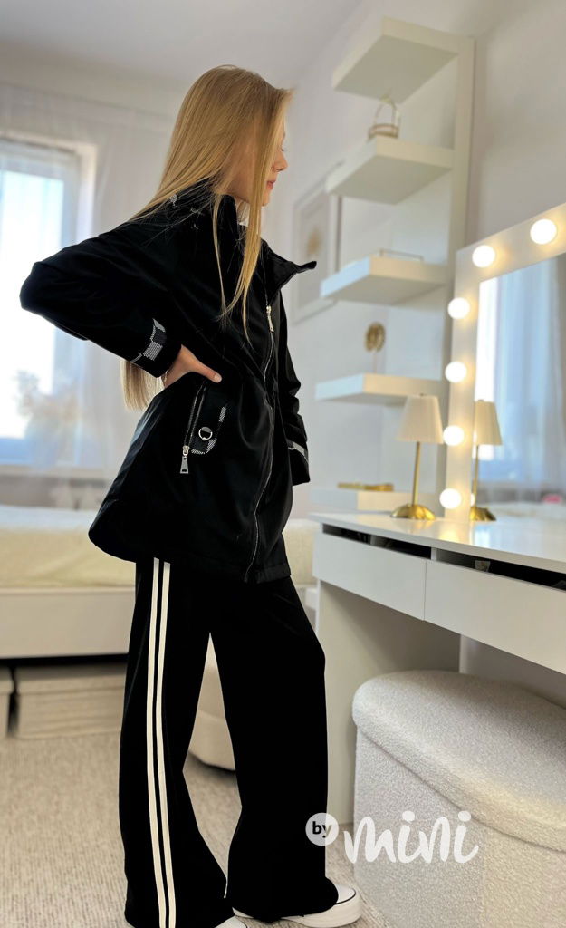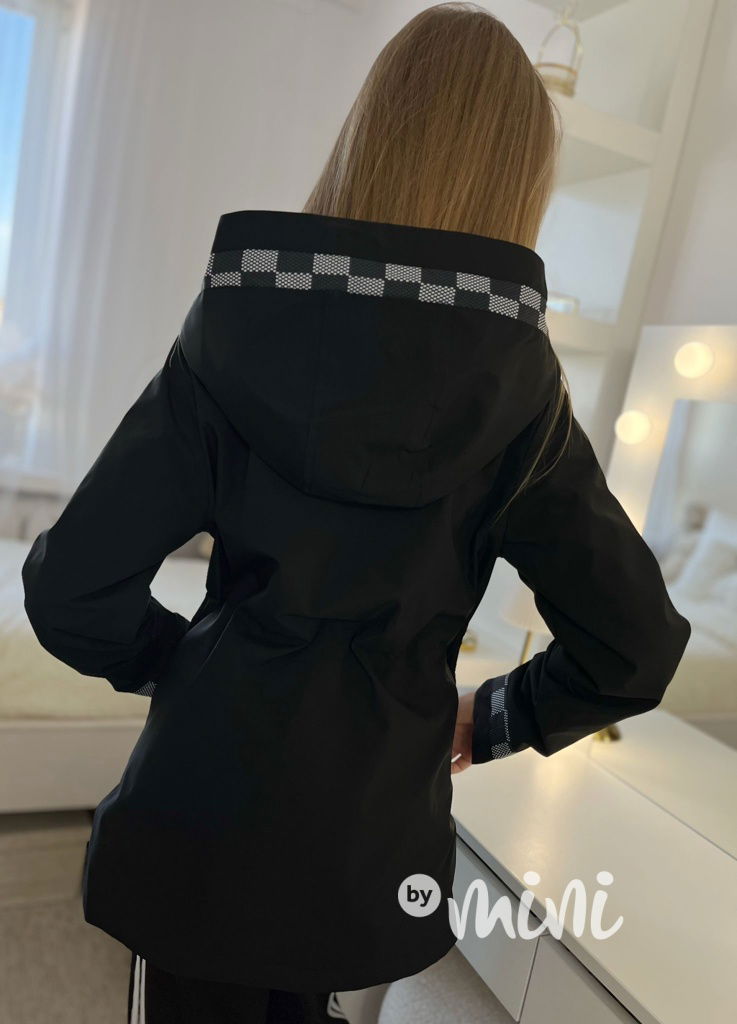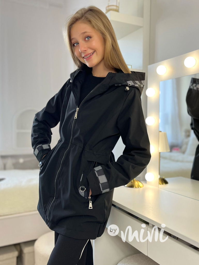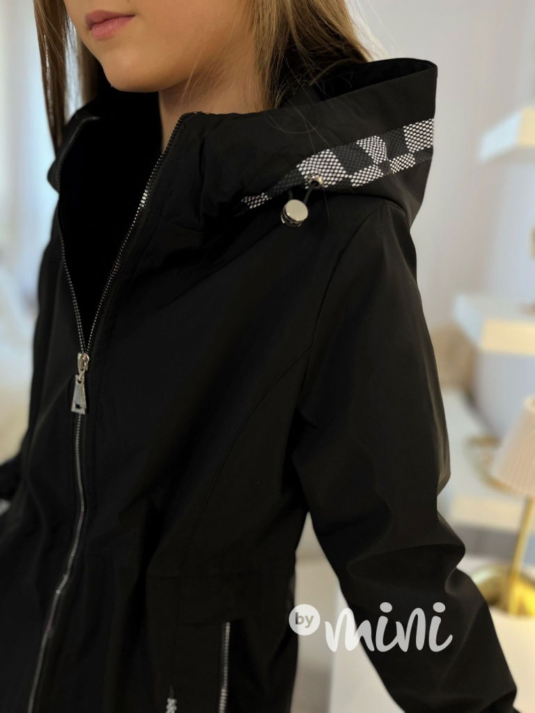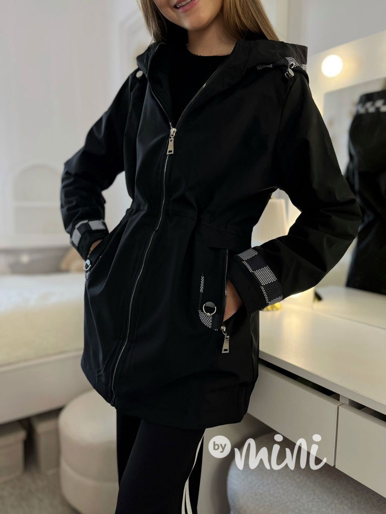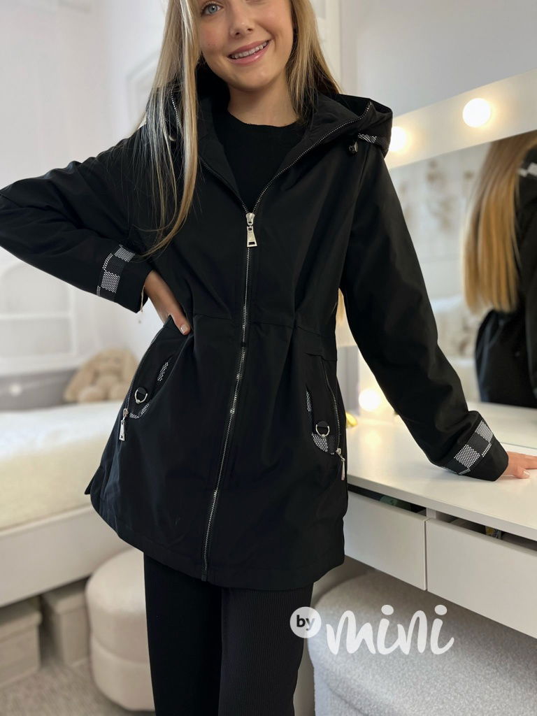 Podzimní parka s kapucí, v pase na stahování, kapsy po stranách.