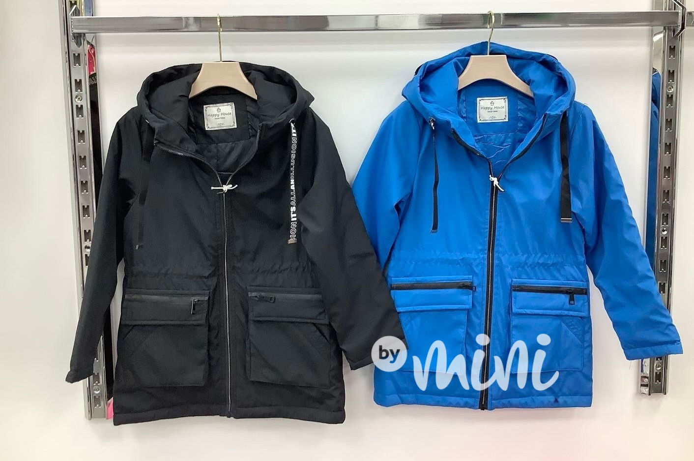 Jarní parka s kapucí, v pase na stahování, kapsy po stranách.