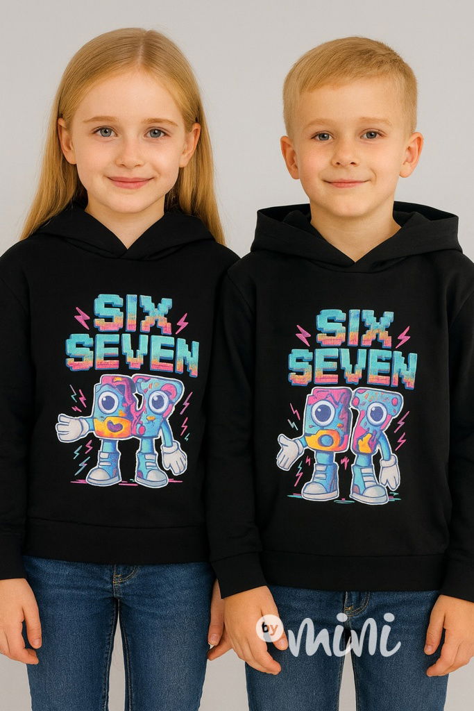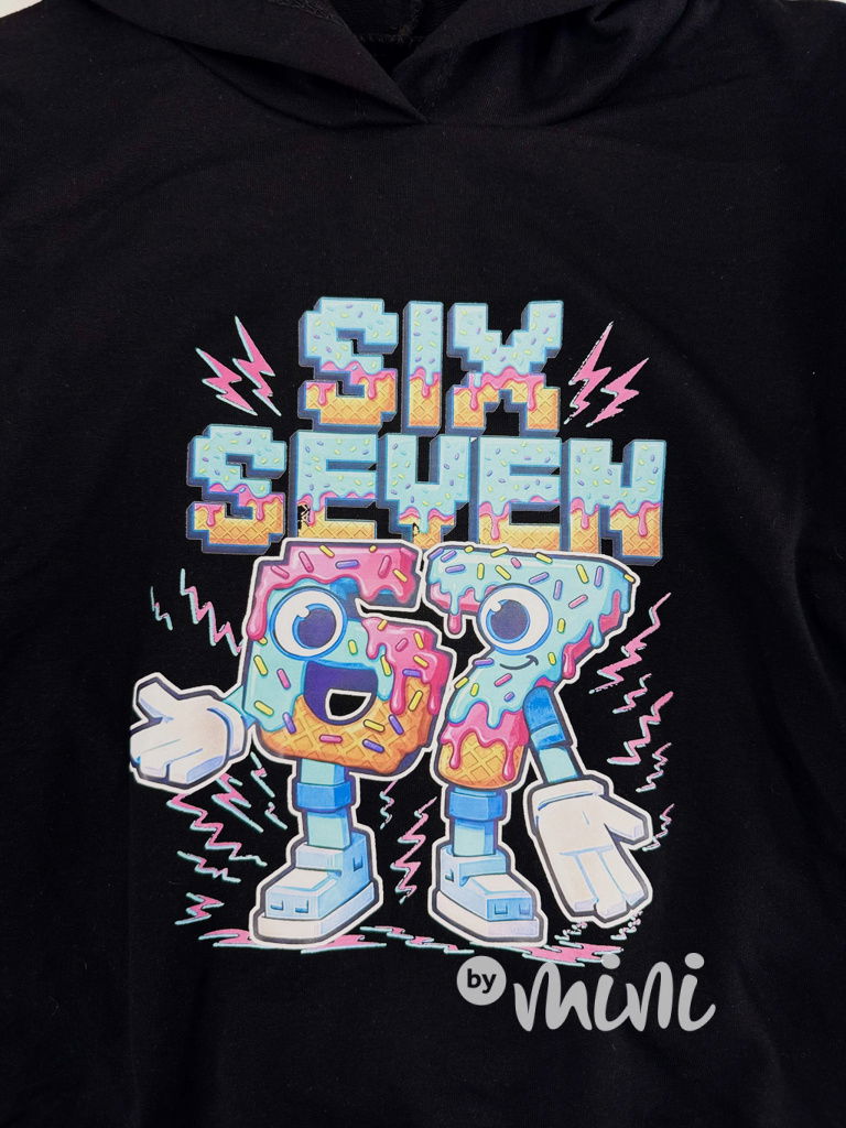 Černá bavlněná mikina s kapucí, vpředu motiv Six Seven - 67.