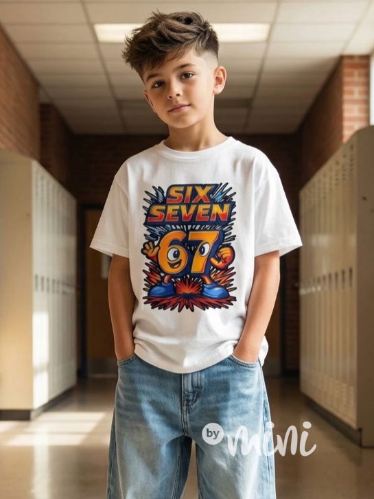 Bílé bavlněné triko, vpředu motiv Six Seven - 67.