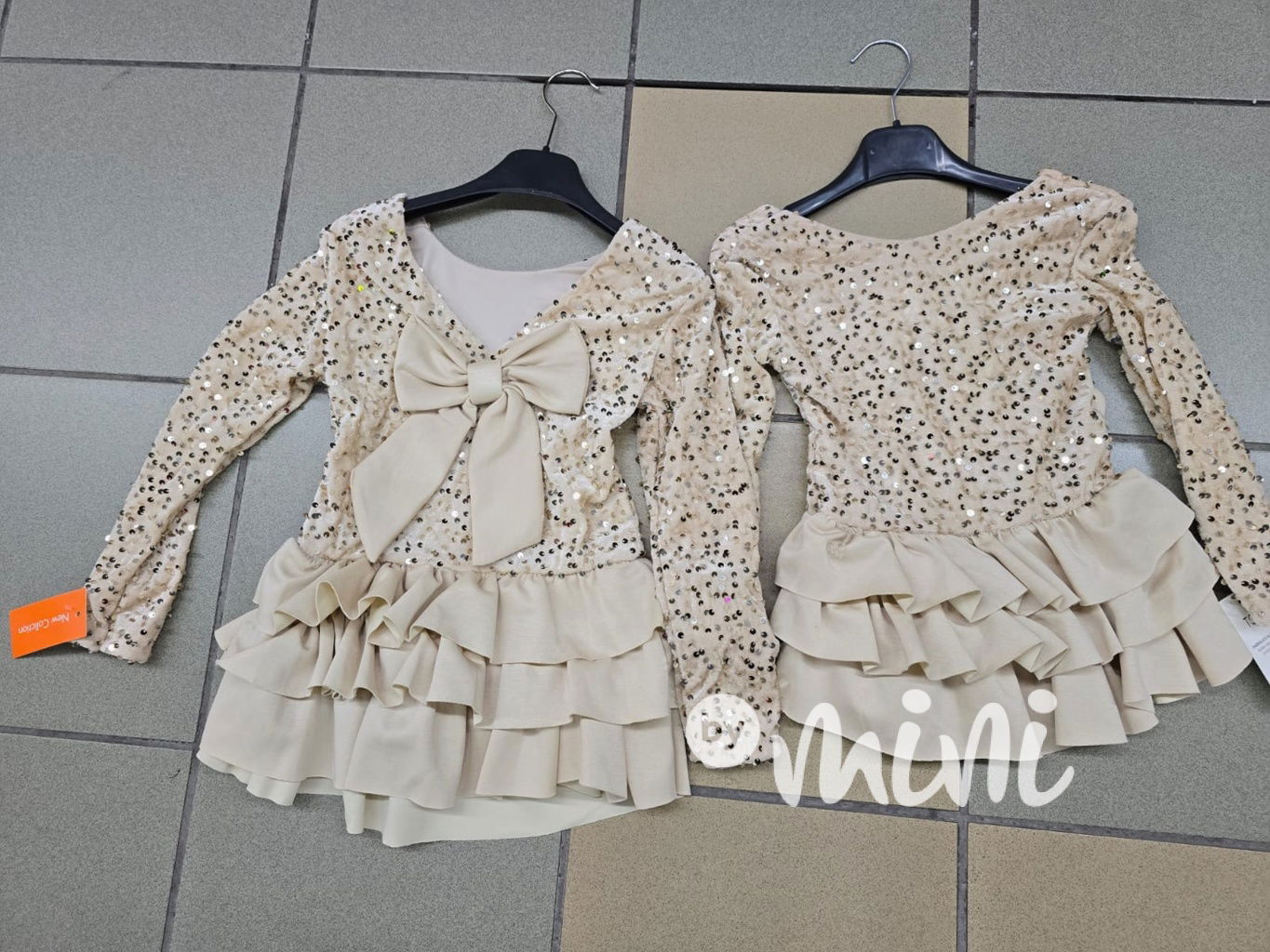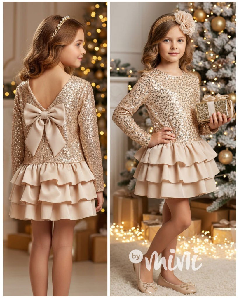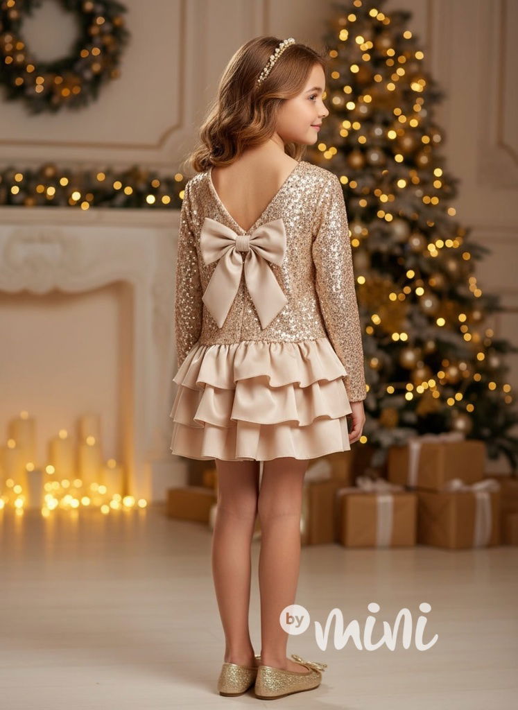 Krásné slavnostní flitr šaty s mašlí a vrstvenou sukýnkou.