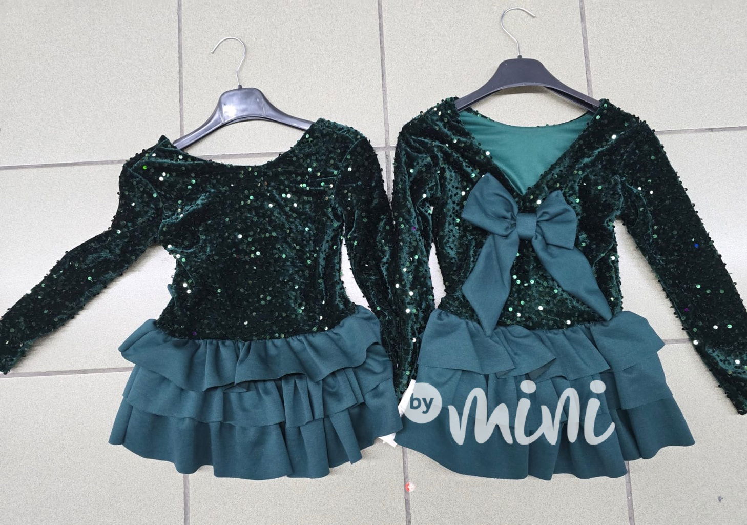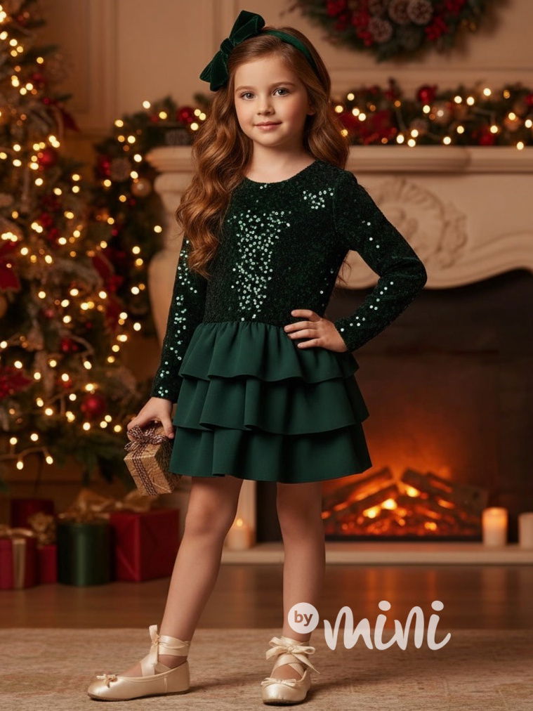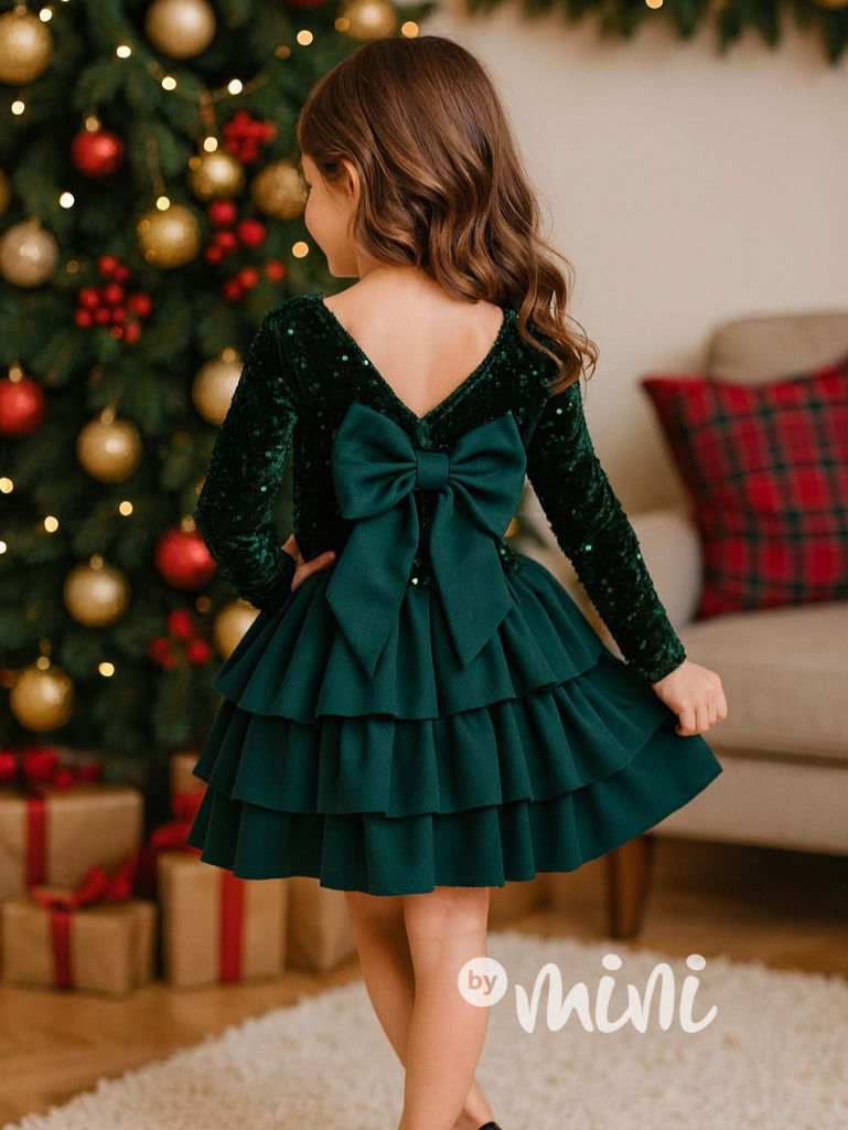 Krásné slavnostní flitr šaty s mašlí a vrstvenou sukýnkou.