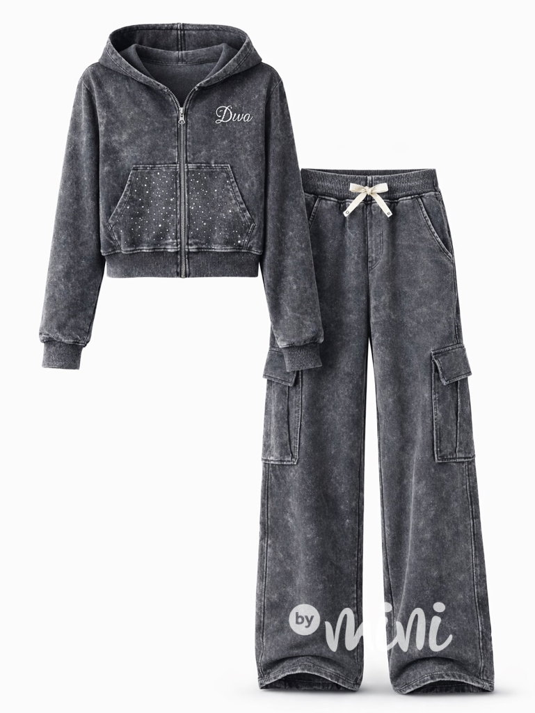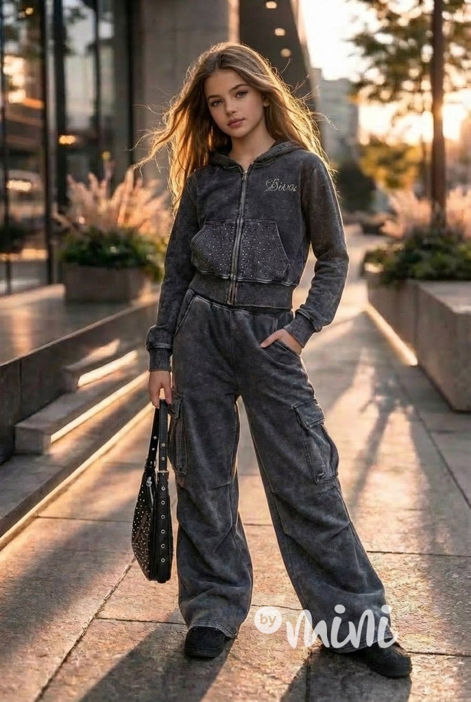 Trendy komplet: široké volné cargo tepláky + mikina s kamínky.