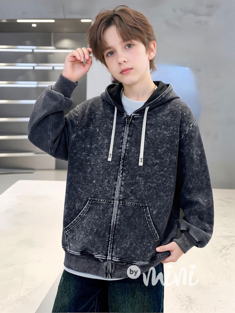 Stylová pohodlná bavlněná soft denim mikina na zip s kapucí, volný střih.