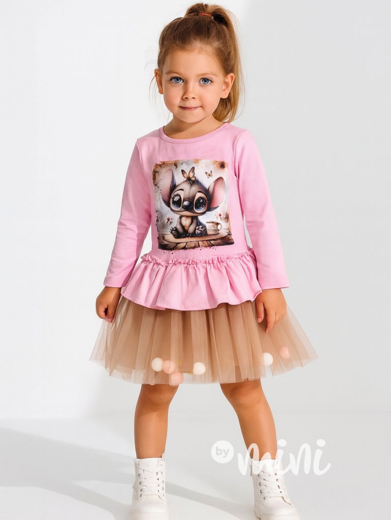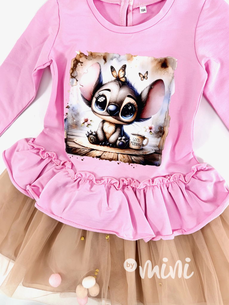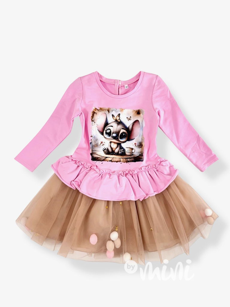 PREMIUM kolekce - bavlněné kvalitní šaty s motivem STITCHe, bohatá tylová sukýnka uvnitř mini pompony a flitry.