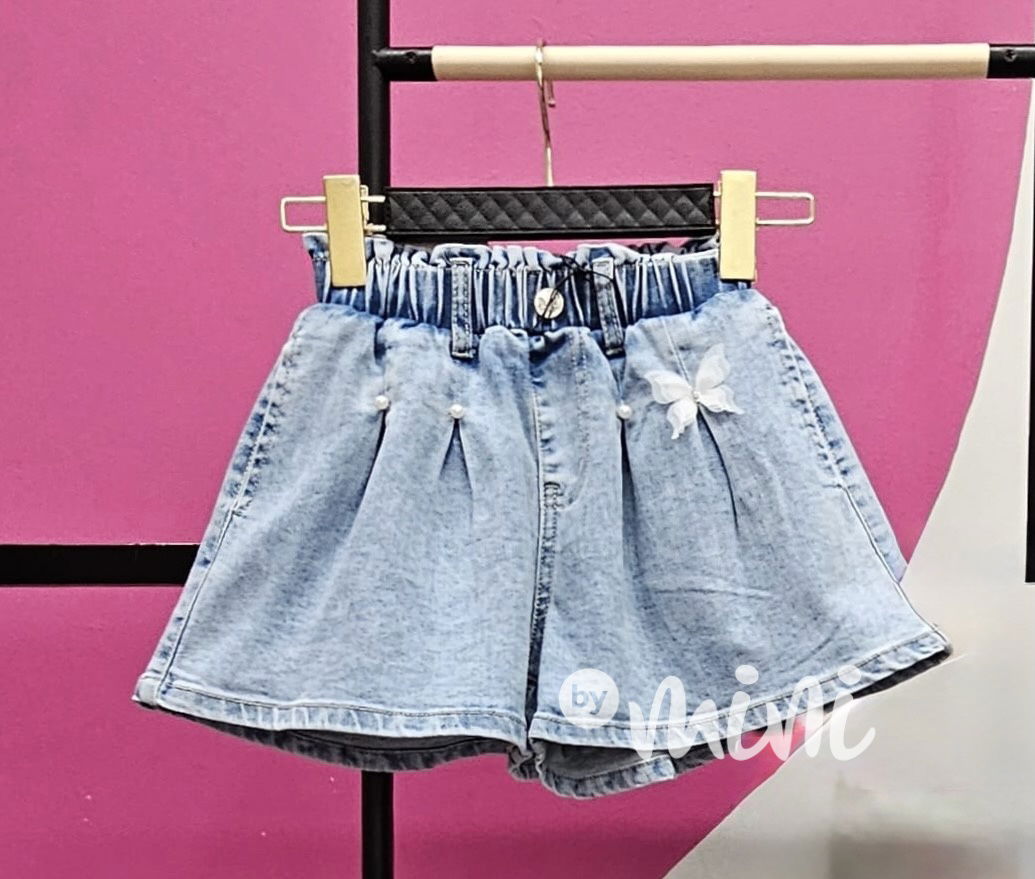 Stylové široké stretch denim kraťasy, zdobení perličky a motýlek, pas na stretch gumu, kapsy po stranách.