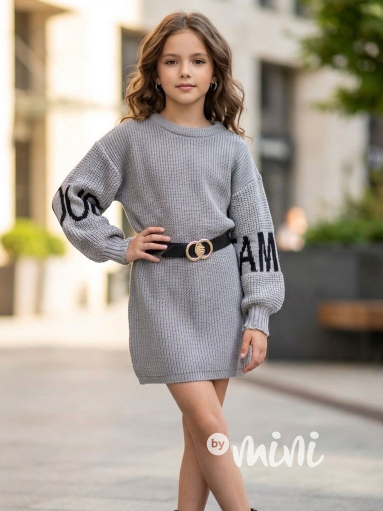 Svetrové šaty s balonovými rukávy a páskem GREY