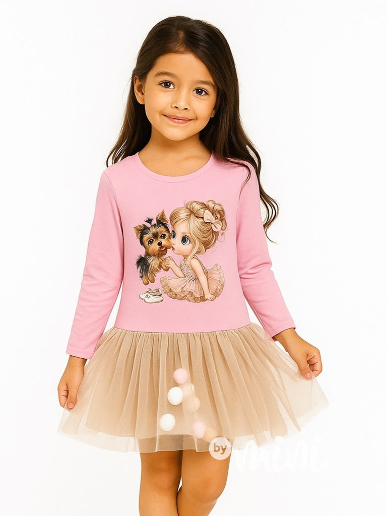 PREMIUM kolekce - bavlněné kvalitní šaty s motivem, bohatá tylová sukýnka uvnitř mini pompony a flitry.