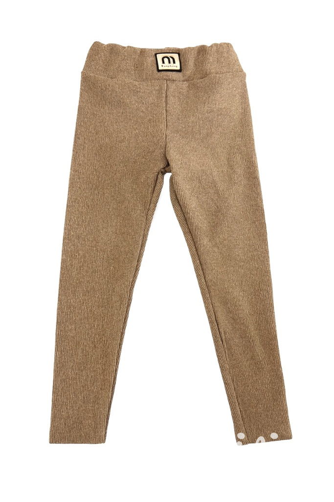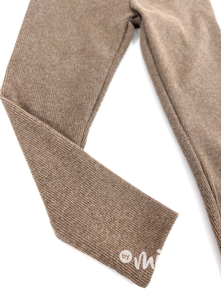 Příjemné teplé legíny v žebrovaném vzoru, pas na stretch gumu, vpředu aplikace.