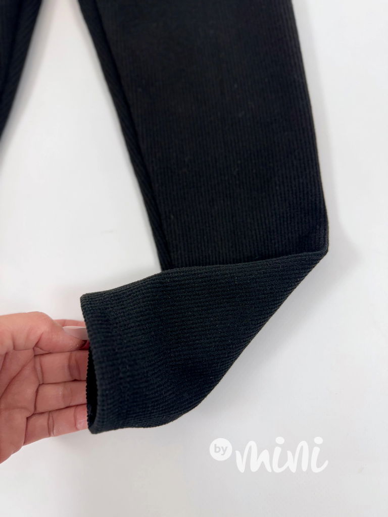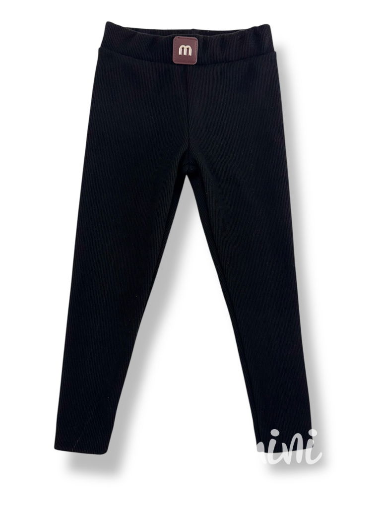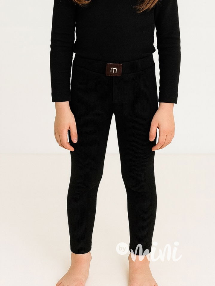 Příjemné teplé legíny v žebrovaném vzoru, pas na stretch gumu, vpředu aplikace.