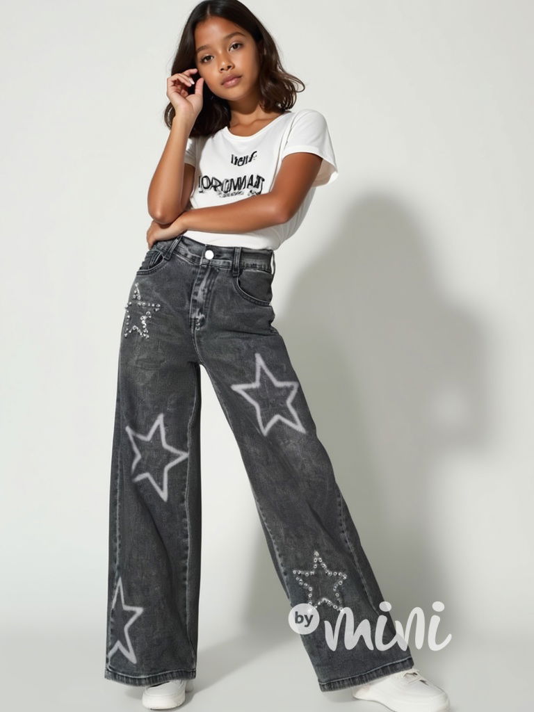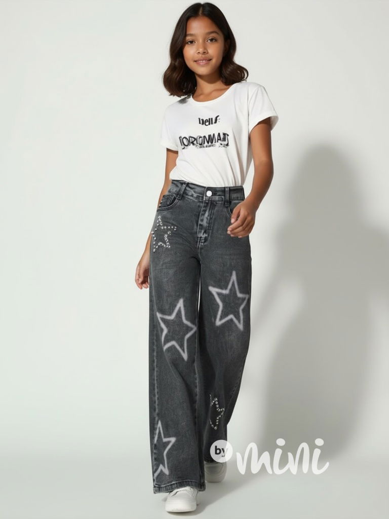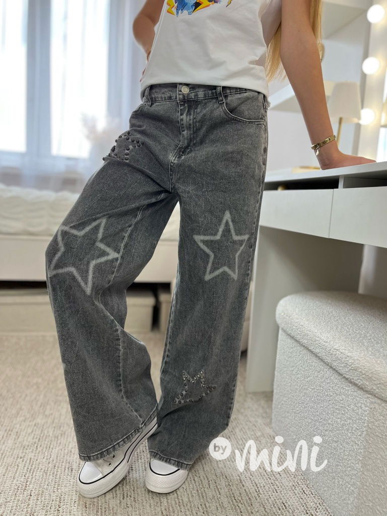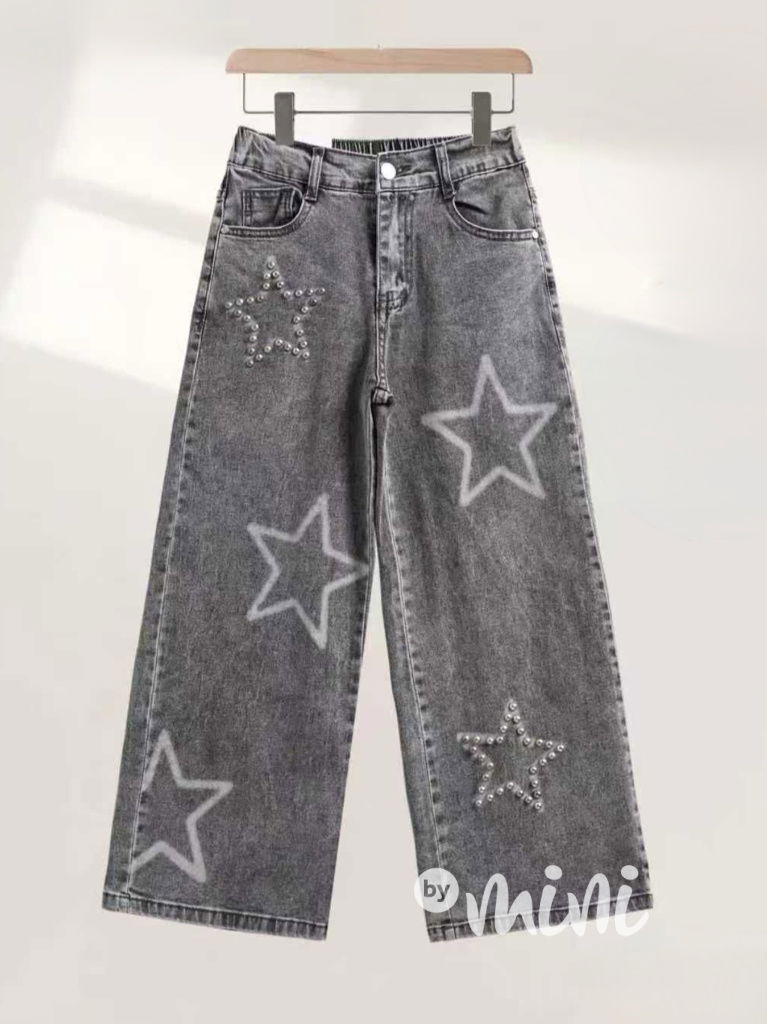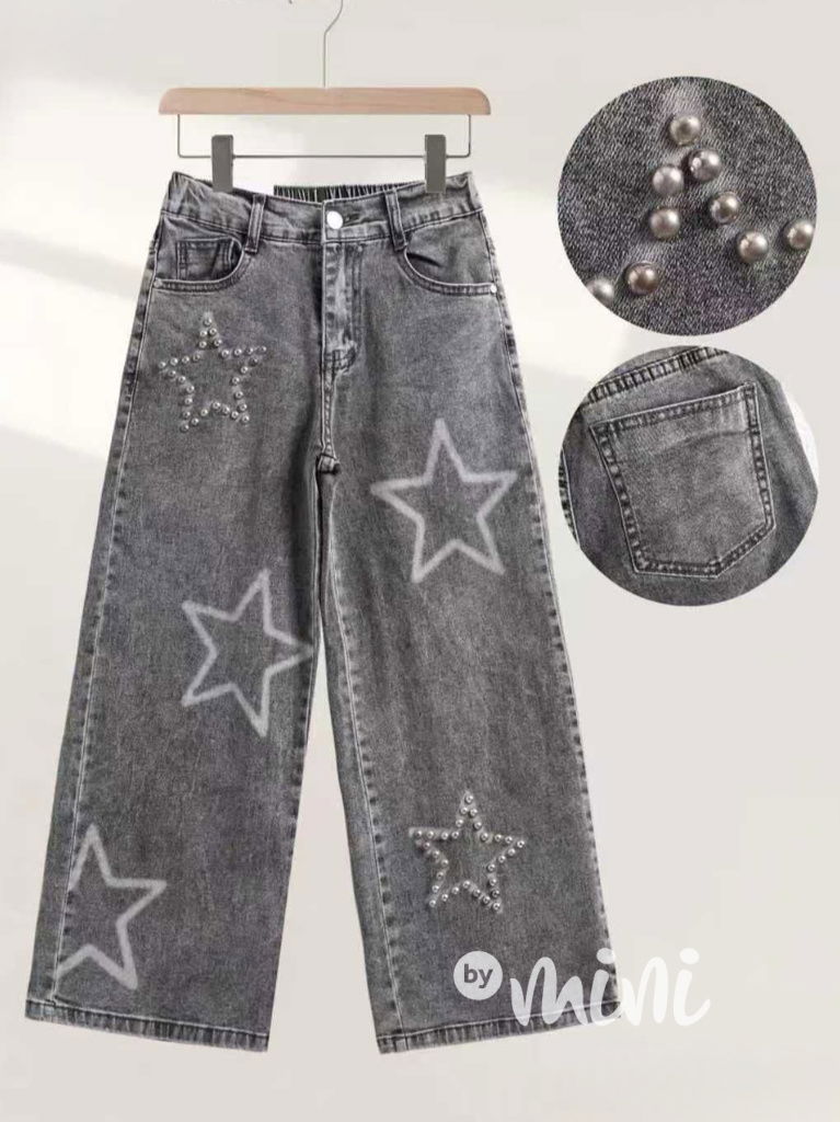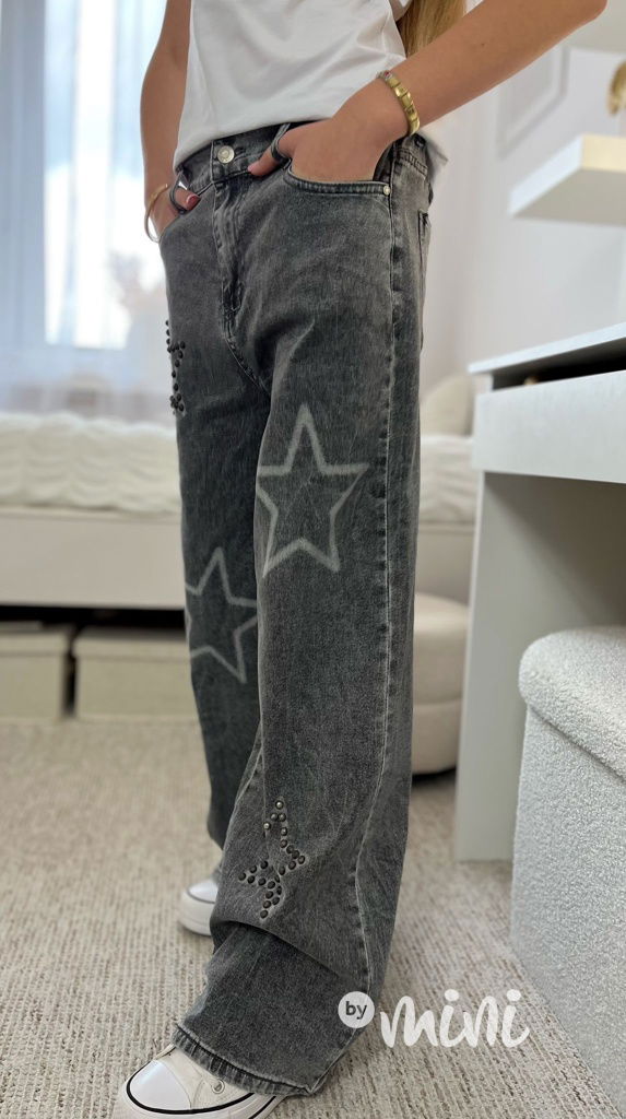 Stretch džíny se zdobením z perliček, motiv hvězd, v pase stretch guma.