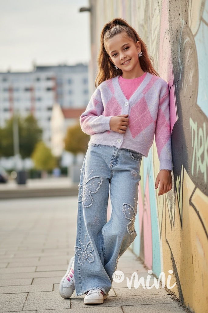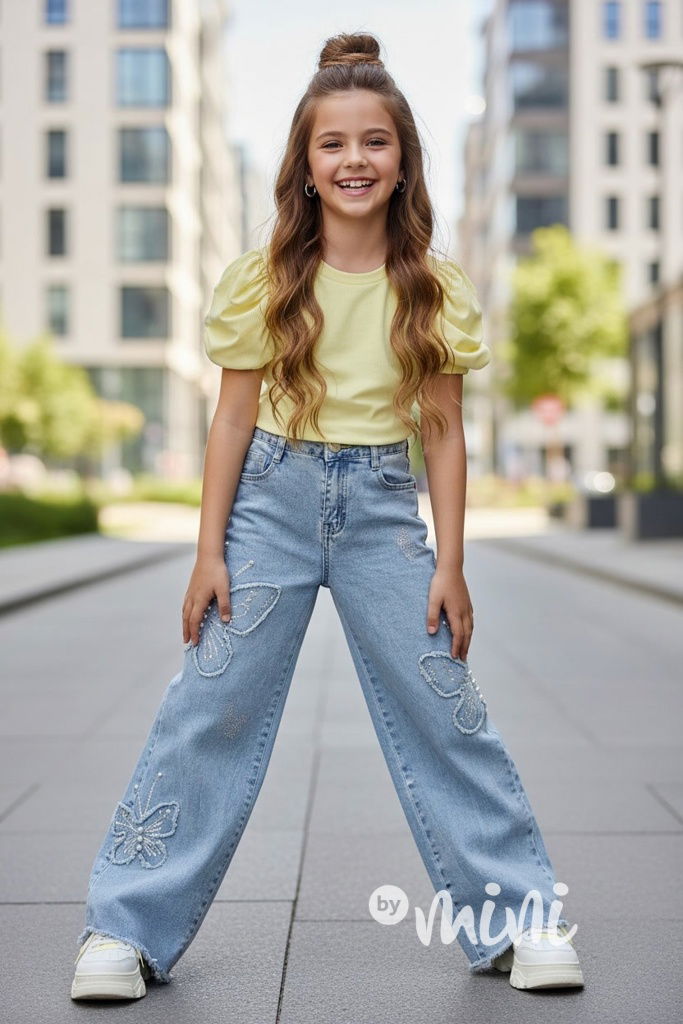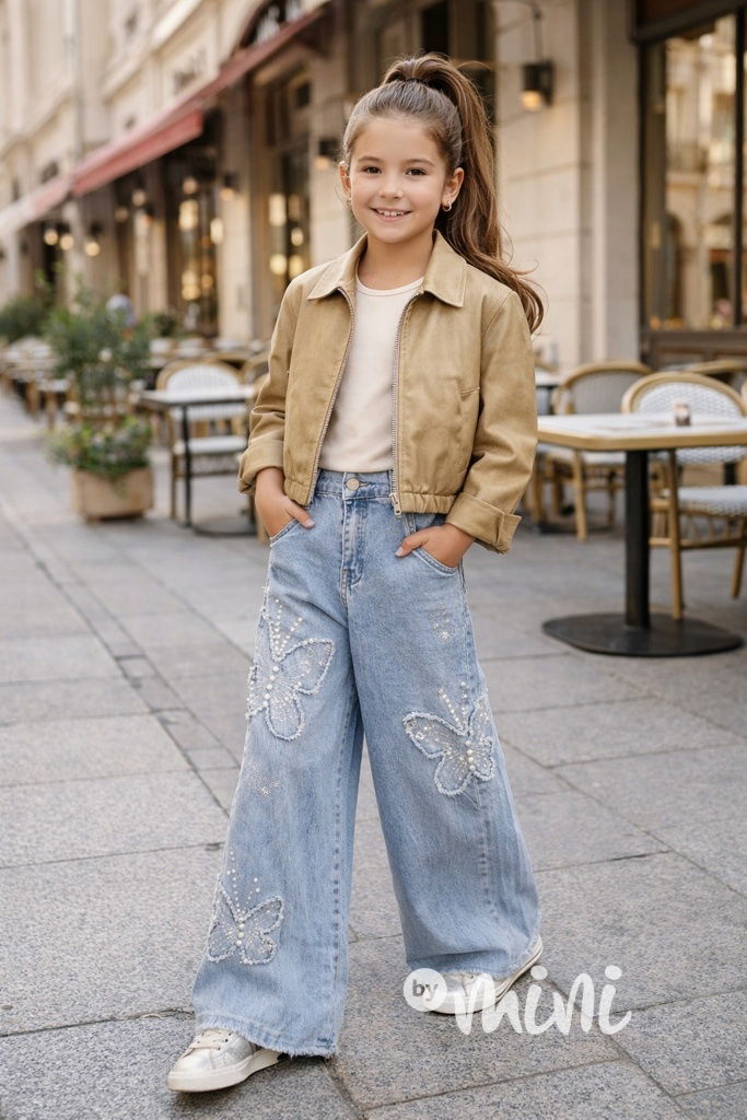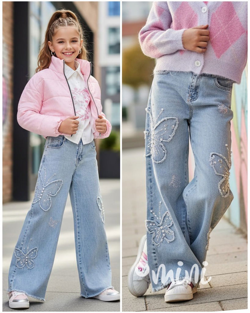 Trendy volné lounge baggy džíny z nové kolekce 2026, motiv motýlků zdobený perličkami.