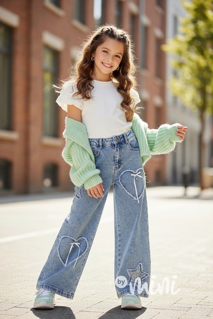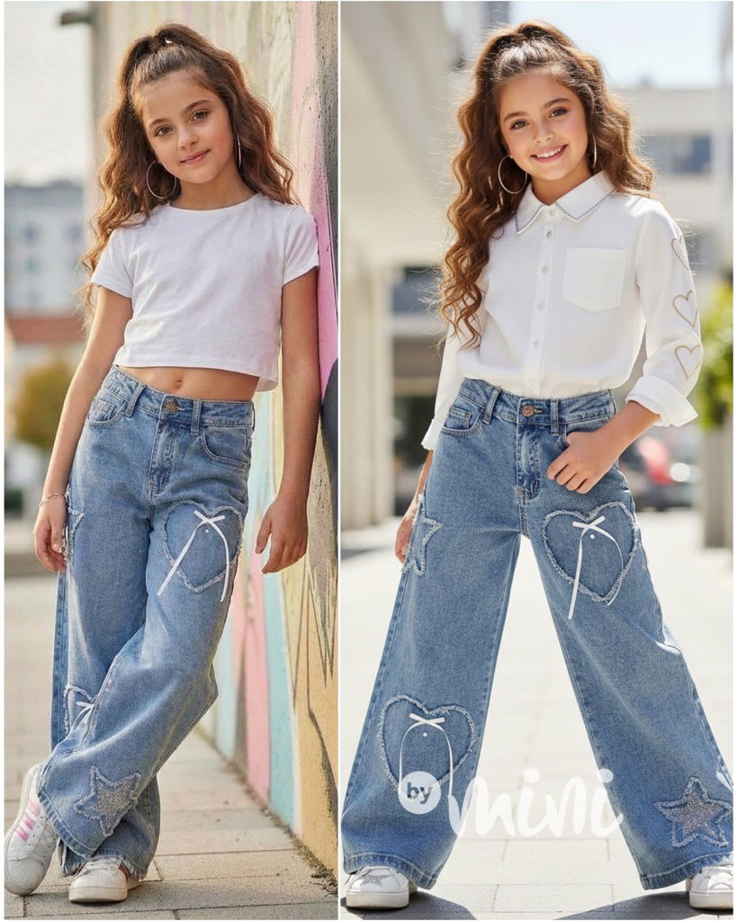 Trendy volné lounge baggy džíny z nové kolekce 2026, motiv srdíček a hvězd.