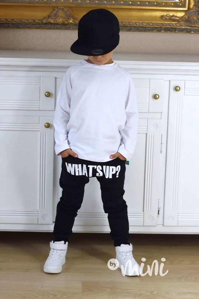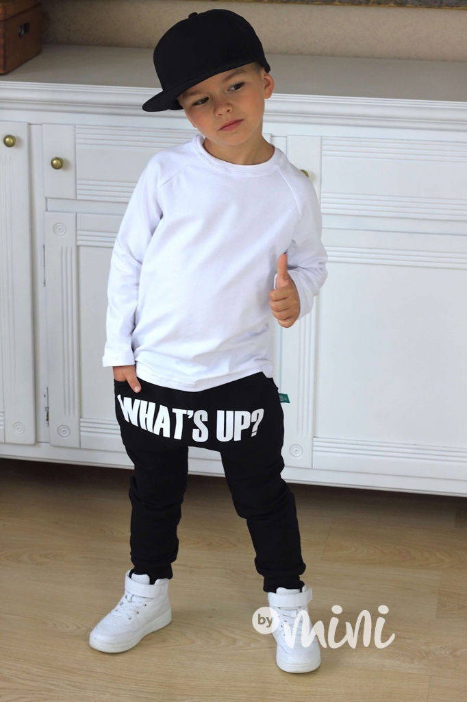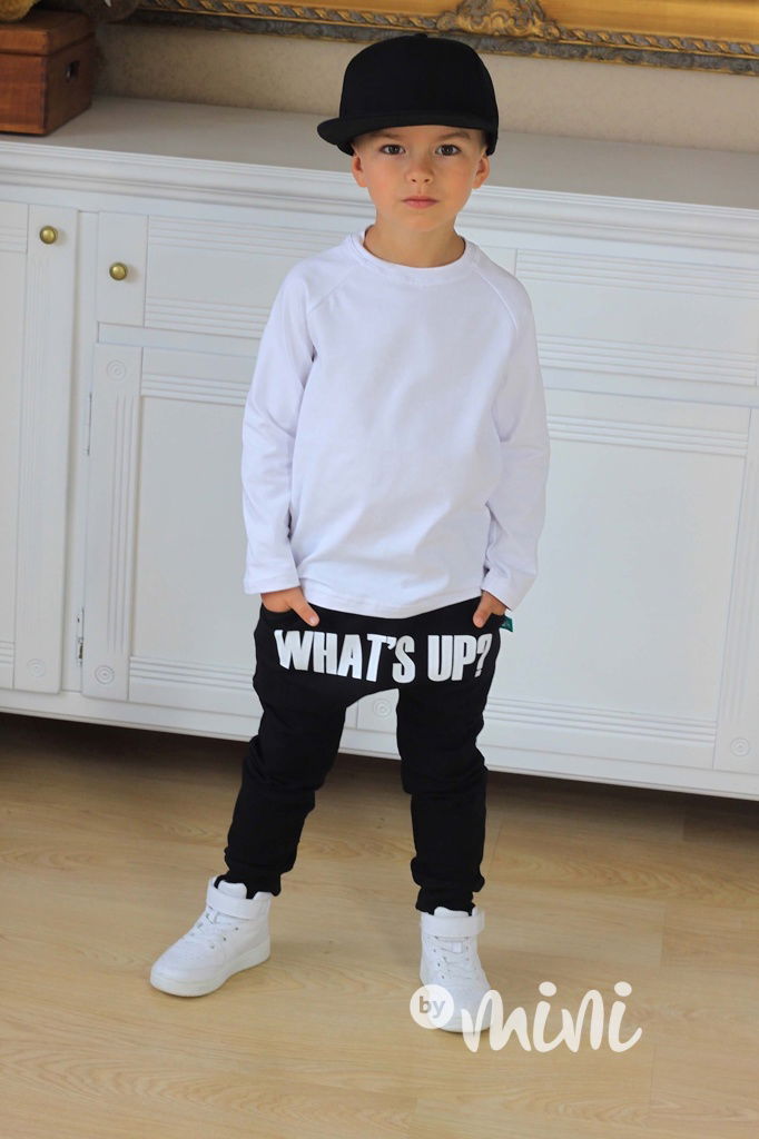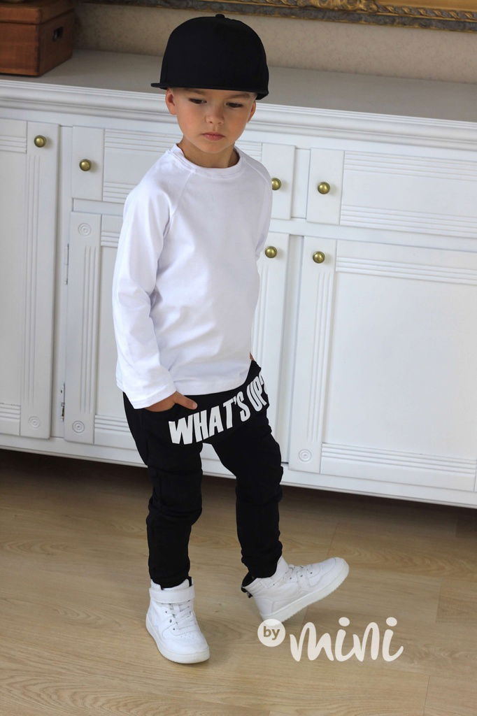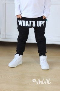Černé tepláčky s lehce sníženým sedem, vpředu bílý nápis.