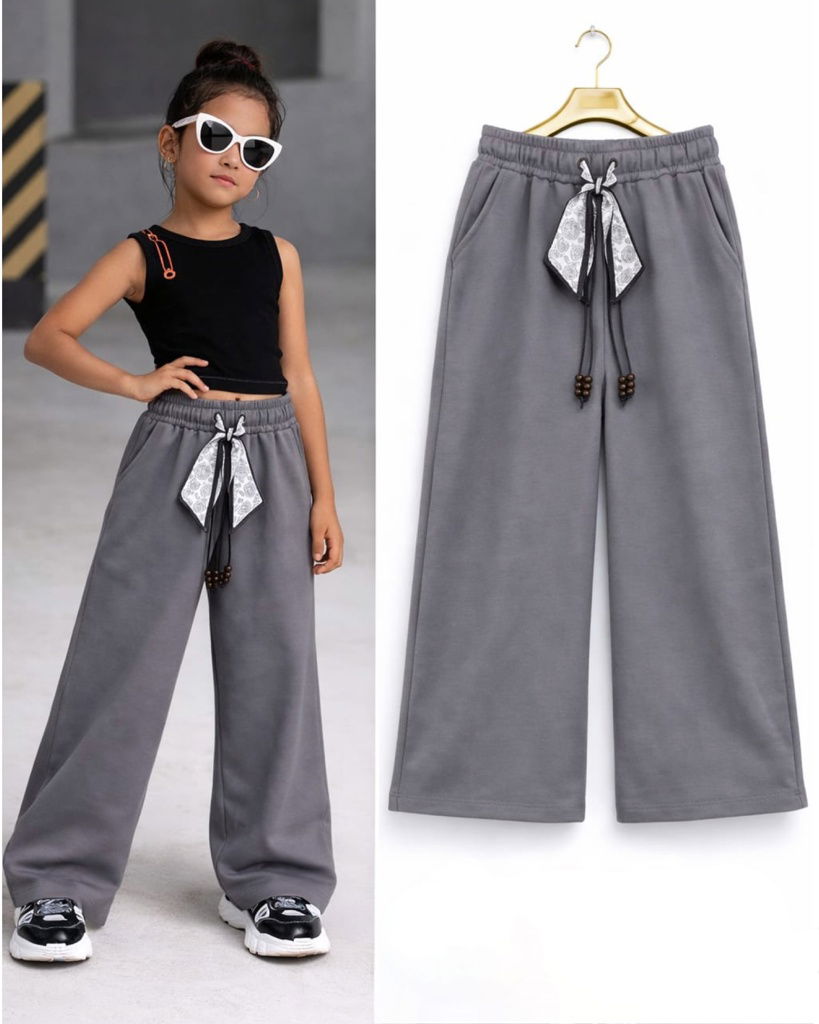 Stretch příjemné tepláky volného širokého střihu, pas na stretch gumu, kapsy po stranách, ozdobná šňůrka s mašlí.
