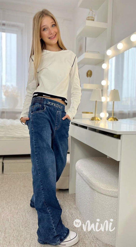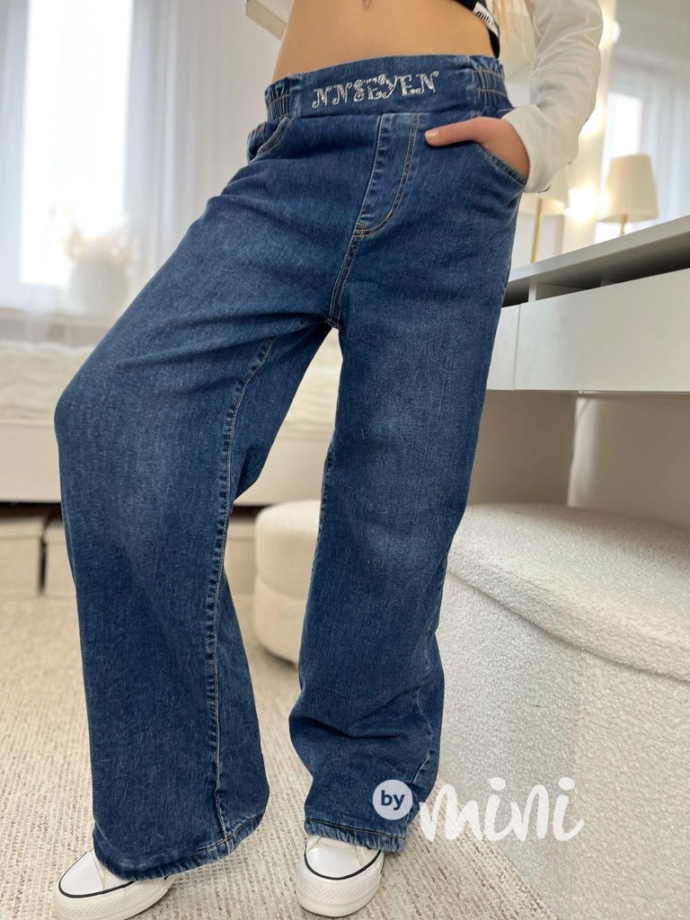 Volné trendy stretch denim kalhoty, pas na stretch gumu, zdobení z kamínků.