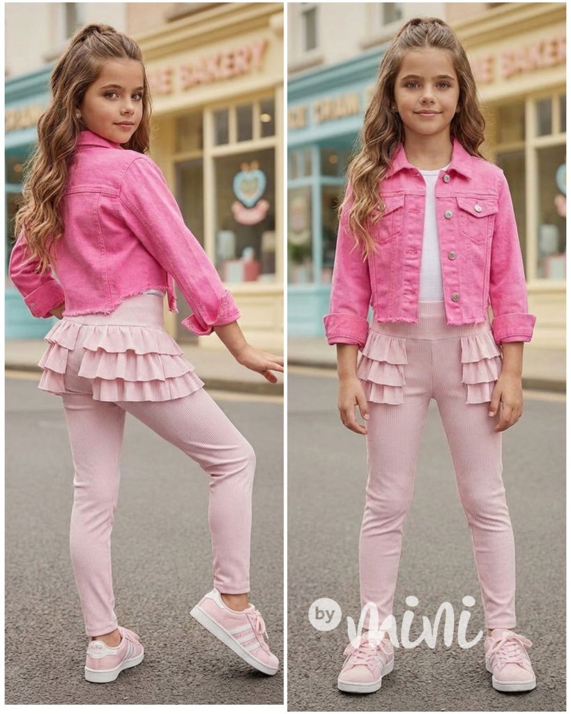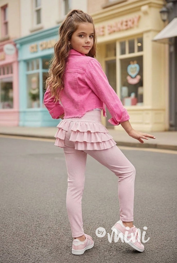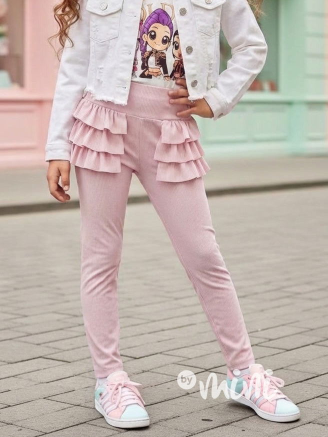 Žebrované legíny s volánky růžové
